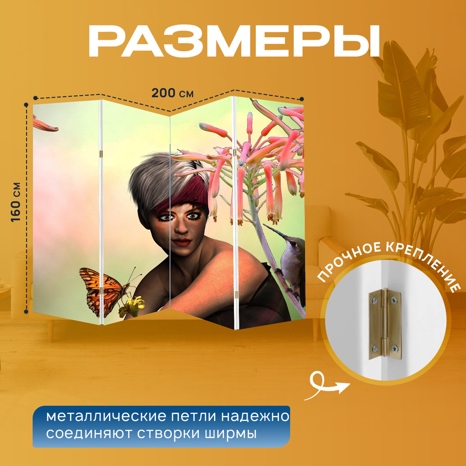 Ширма "Колибри, женщина, цветы" раскладная перегородка для зонирования с принтом на холсте информация: