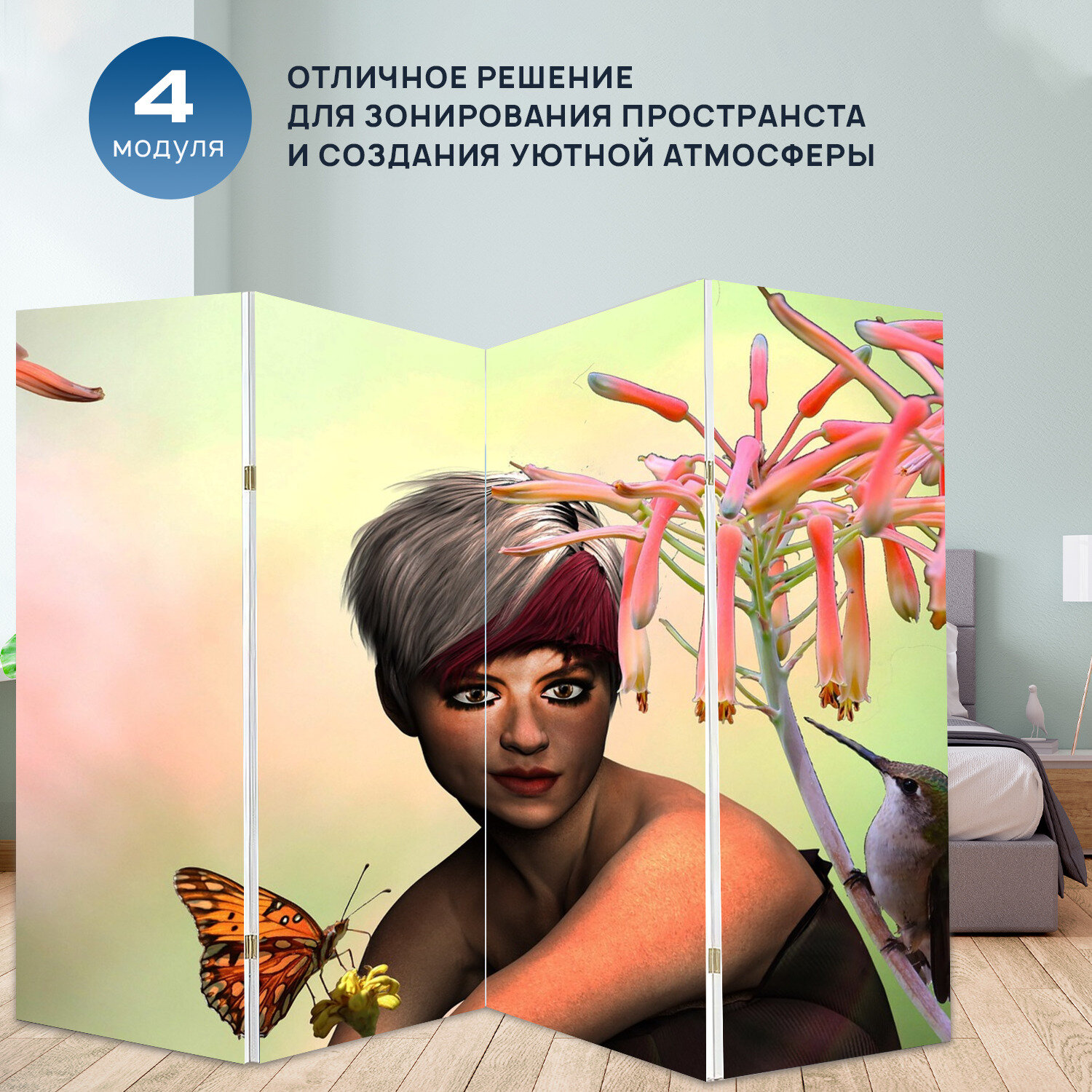 Отзывы на Ширма "Колибри, женщина, цветы" раскладная перегородка для зонирования с принтом на холсте