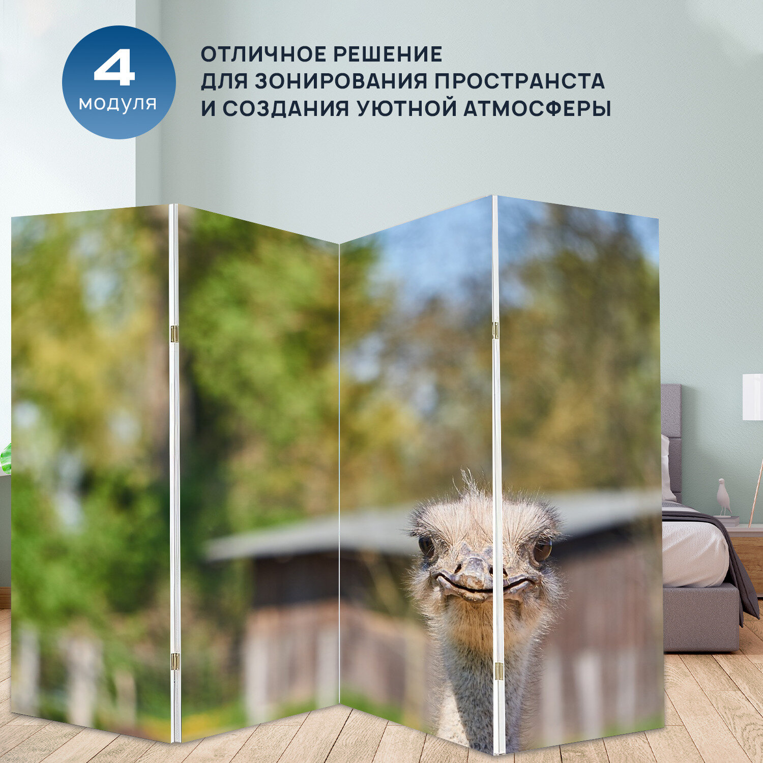 Отзывы на Ширма "Страус, птица, животное" раскладная перегородка для зонирования с принтом на холсте