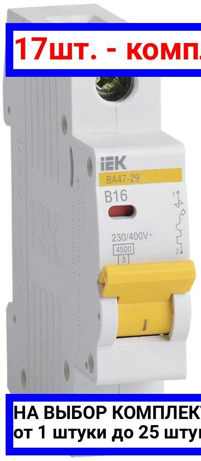 10 цен на 17шт. - Выключатель автоматический однополюсный 16А В ВА47-29 4.5кА / IEK; арт. MVA20-1-016-B; оригинал / - комплект 17шт