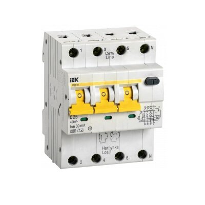 Дифференциальный автоматический выключатель IEK АВДТ34 3П+N 25А 30мА, тип A, 6кА, C , MAD22-6-025-C-30