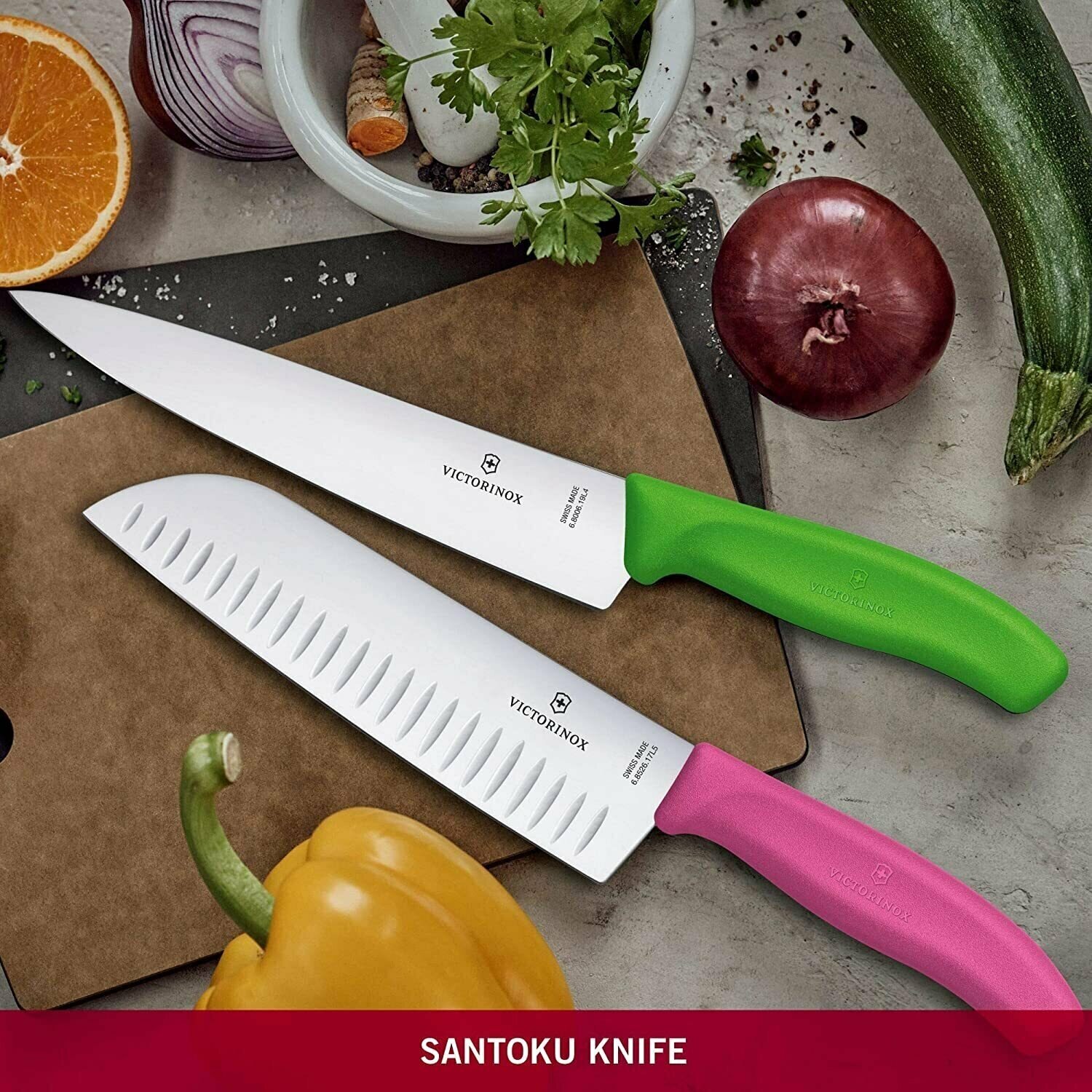 Отзывы на Нож сантоку VICTORINOX Swiss Classic, рифлёное лезвие из нержавеющей стали 17 см, рукоять розового цвета (6.8526.17L5B)