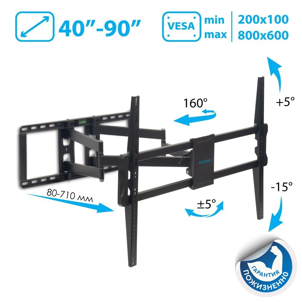 Кронштейн Kromax ATLANTIS-75 black (Наклонно-поворотный для LED TV 40-90, 3 ст. свободы, VESA максимум 800х600 ), нагрузка максимум 101кг 7 833 ₽