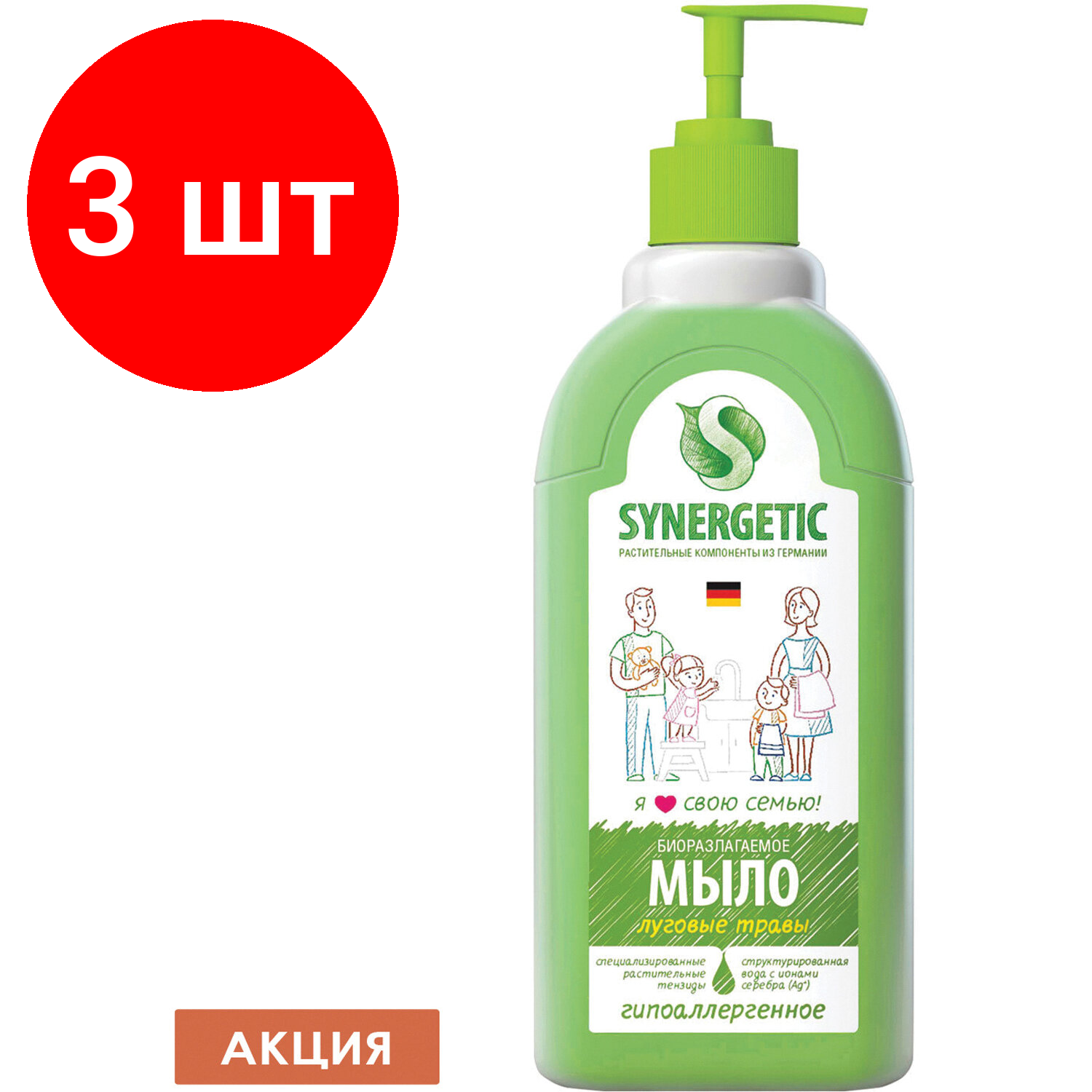 Отзывы на Комплект 3 шт, Мыло жидкое 500 мл SYNERGETIC "Луговые травы", гипоаллергенное, биоразлагаемое, дозатор, 105053
