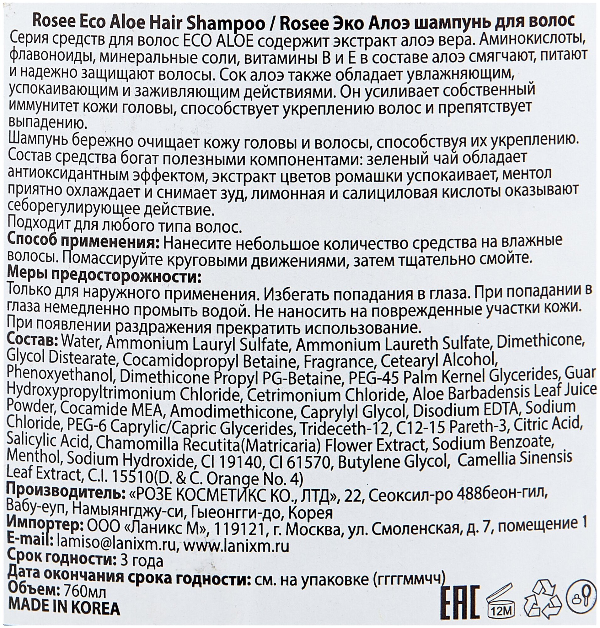 Шампунь Rosee для волос, эко алоэ, 760 мл информация: