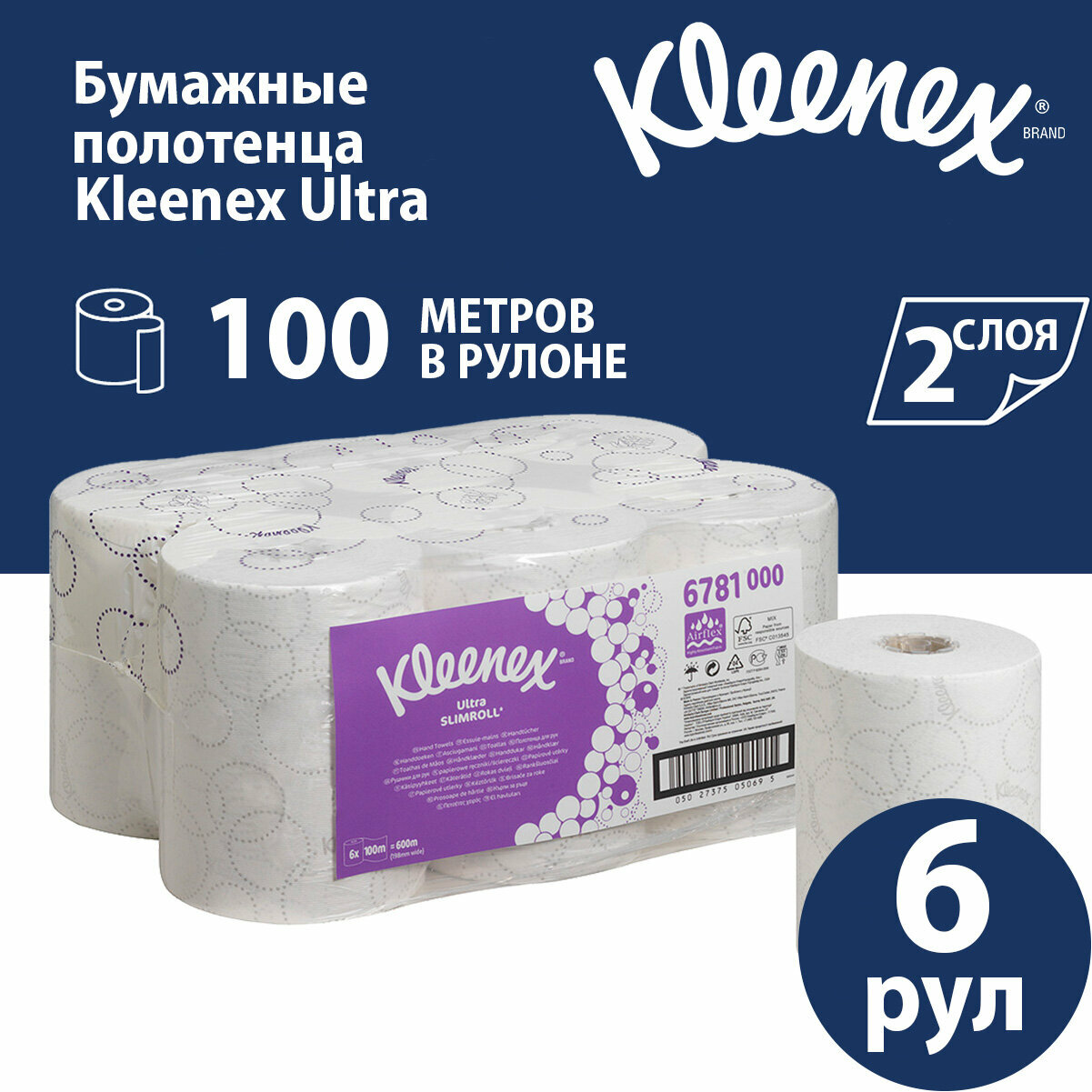 Бумажные полотенца в рулонах 6781 Kleenex Ultra Slimroll белые 2 слоя (6 рул х 100 м) информация: