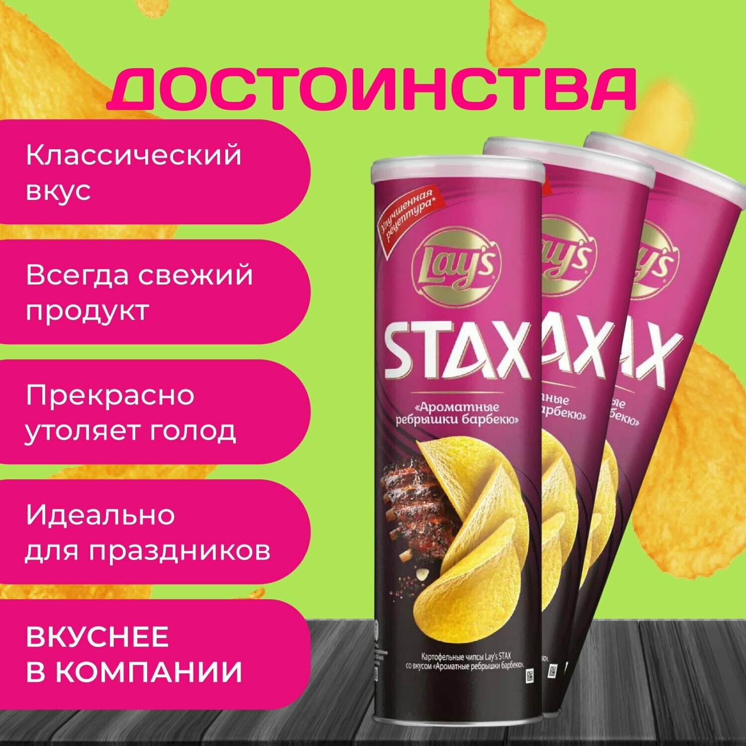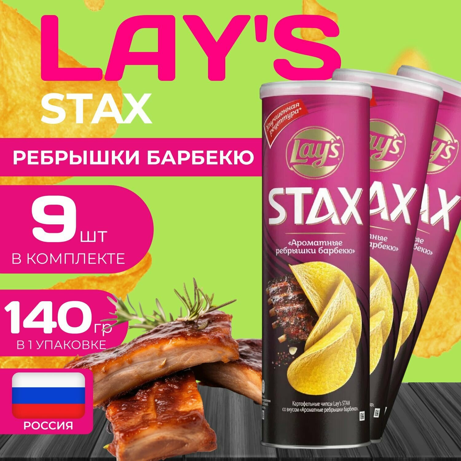 Картофельные чипсы Lays Stax "Ребра барбекю" 140 гр. 9 шт. Лейс информация: