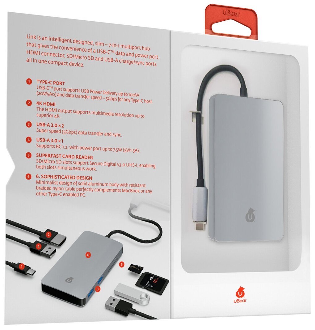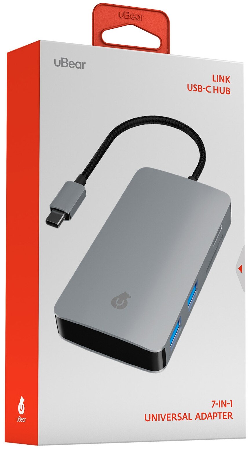 Адаптер мультипортовый uBear Link USB-C Hub 7 в 1 (HB01SG01-TC), серый информация: