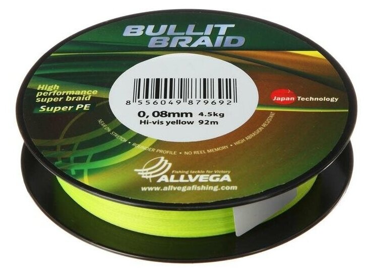 Плетеный шнур Allvega Bullit Braid 92м 0,08мм 4,5кг, ярко-желтая информация: