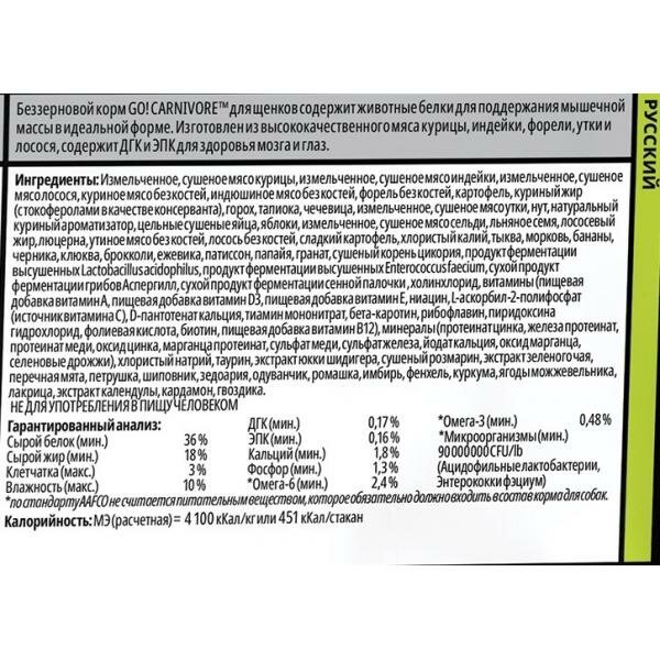 GO! Беззерновой для щенков всех пород 4 вида мяса: индейка, курица, лосось, утка (GO! CARNIVORE GF Chicken,Turkey + Duck Puppy Recipe DF), 10 кг информация: