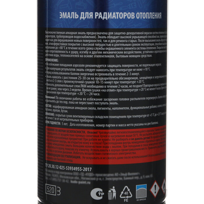 Аэрозольная алкидная краска для радиаторов отопления Kudo KU-5102, матовая, 520 мл, белая 485 ₽