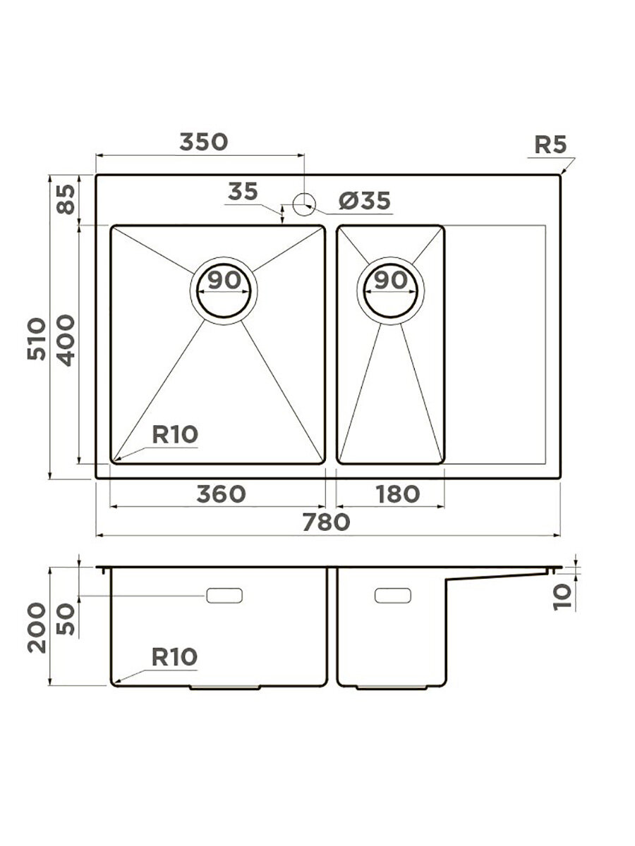 Мойка FABIA 62322L сатин врезная 78х48 см левая + большой сифон с переливом