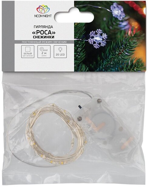Гирлянда светодиодная "Снежинки" 2м 20LED бел. 2Вт 4.5В IP67 провод прозр. элементы питания 2хCR2032 (в компл.), NEON-NIGHT 303-010 (1 шт.)