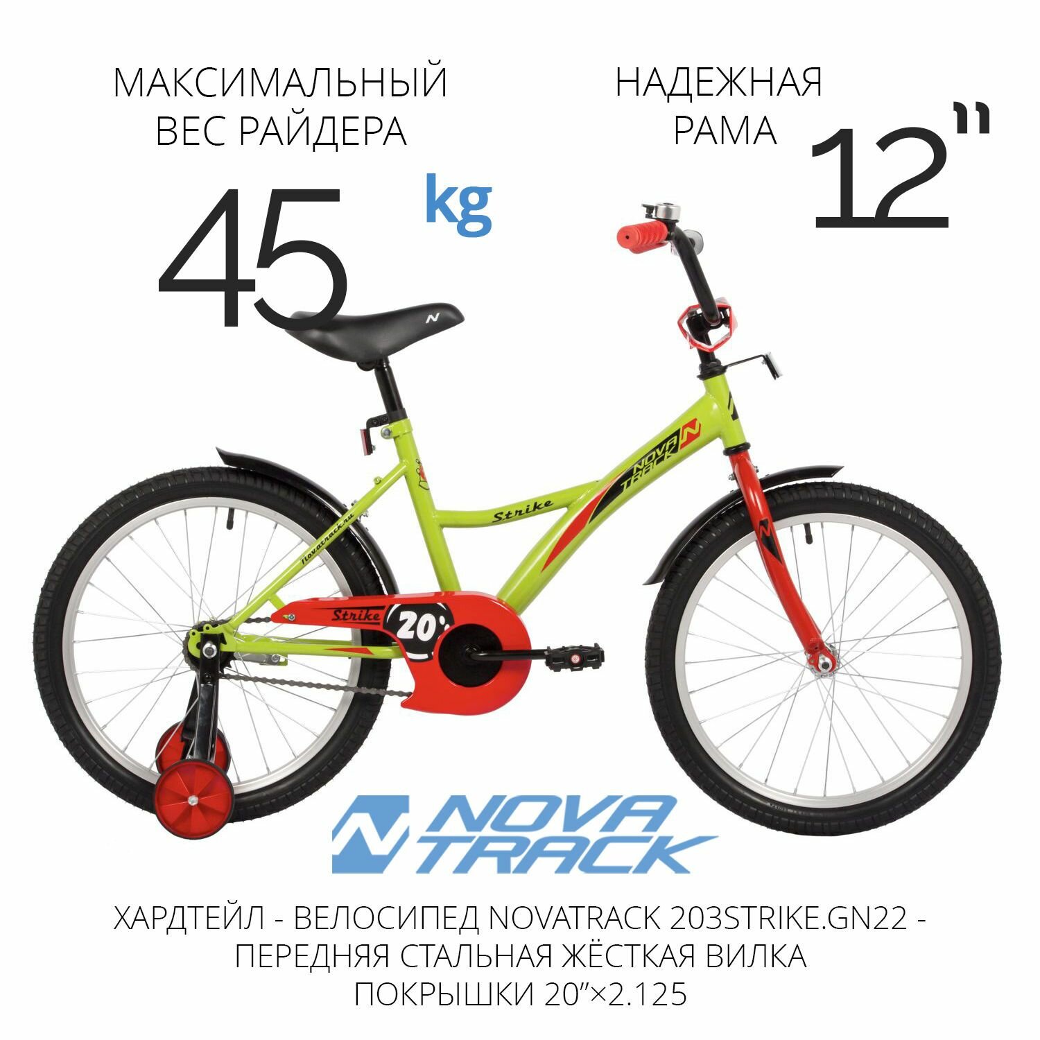 Велосипед детский 20" NOVATRACK STRIKE зеленый для девочек и мальчиков от 7 до 10 лет на рост 125-130 см, двухколесный городской велик со съемными боковыми колесами информация: