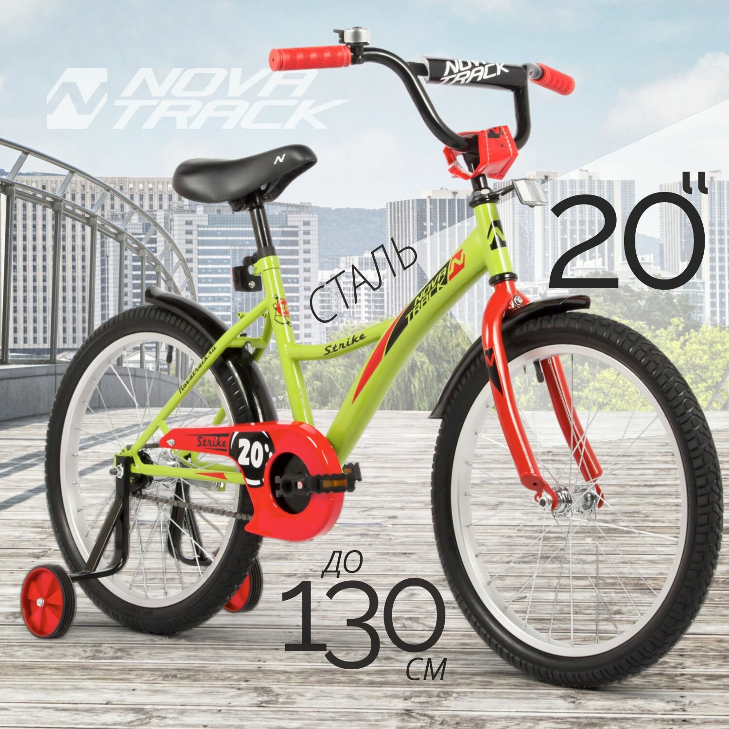 Отзывы на Велосипед детский 20" NOVATRACK STRIKE зеленый для девочек и мальчиков от 7 до 10 лет на рост 125-130 см, двухколесный городской велик со съемными боковыми колесами