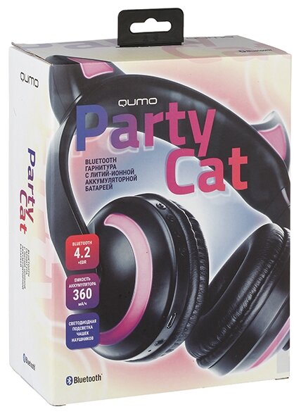 Наушники Qumo Party Cat (ВТ 0024), черный + "ушки" с подсветкой, накладная, Bluetooth 4.2