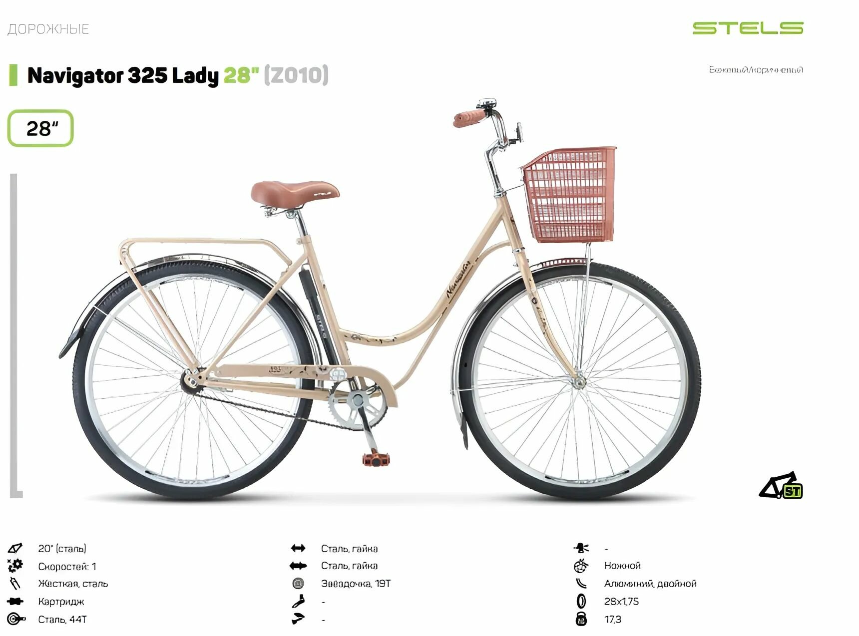 Отзывы на Велосипед взрослый, женский, дорожный городской, Navigator 325 Lady, багажник и корзина в комплекте, 28 " -колеса , 20 " -рама, слоновая-кость / светло бежевый, рост 175-185 см, STELS ( Стелс LU072360 )