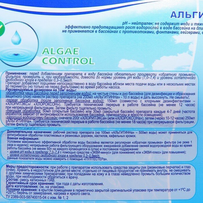 Жидкое средство для обработки плавательных бассейнов альгитинн (предотвращает рост водорослей), 1л.