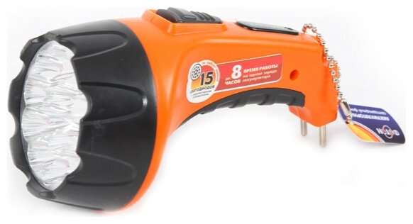 Фонарь ручной аккумуляторный Рекорд оранжевый PM-0115 , выдвижная вилка для зарядки, 15 светодиодов, 8 часов работы, 75Лм, дальность 8м