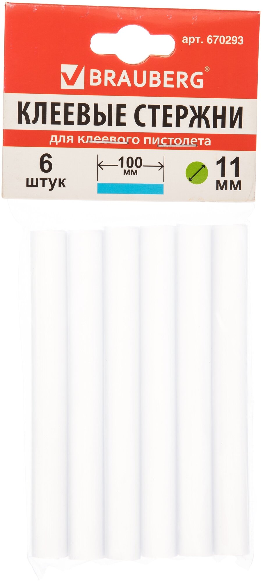 Клеевые стержни для клеевого пистолета, диаметр 11 мм, длина 100 мм, белые, комплект 6 штук, Brauberg, 670298