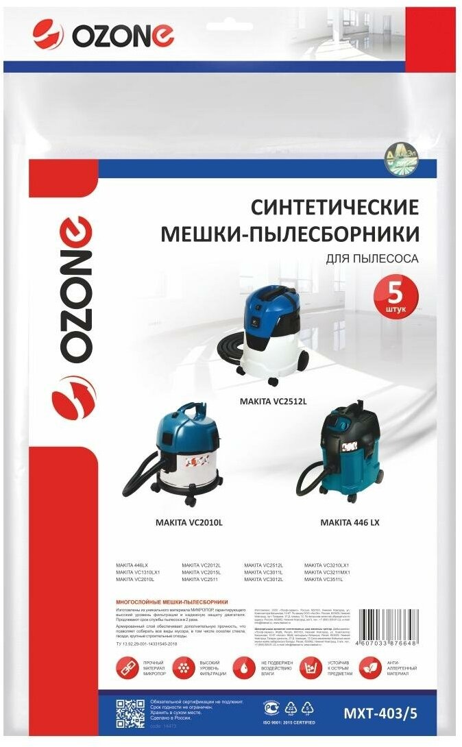 Мешки для пылесоса MAKITA VC2012L VC2512L 5шт. синтетические не боятся мокрой пыли бренд. OZONE арт. MXT-403/5