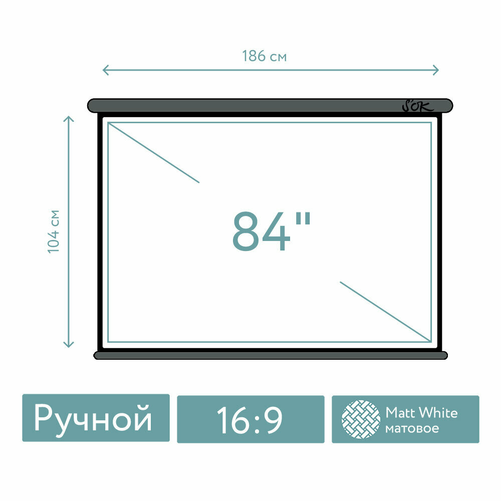 Экран для проектора SOK SCPSW-186x104GR 84 16:9 настенно-потолочный, ручной, матовый, серый информация: