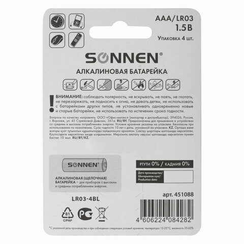Батарейки комплект 4 шт, SONNEN Alkaline, AAA (LR03, 24А), алкалиновые, мизинчиковые, блистер,451088 информация: