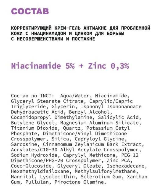 Крем-гель корректирующий для лица антиакне / Niacinamide 5% + Zinc 0,3% 30 мл
