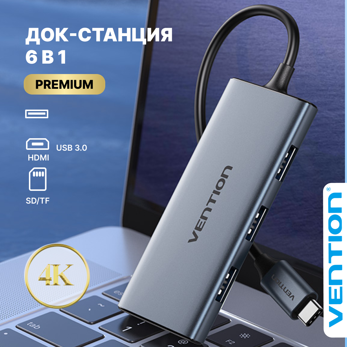 Vention Мультифункциональная док-станция 6 в 1, Type C/USB 3.0 + HDMI + SD + TF для ноутбука, телефона, шнур 15 см, арт. TOOHB