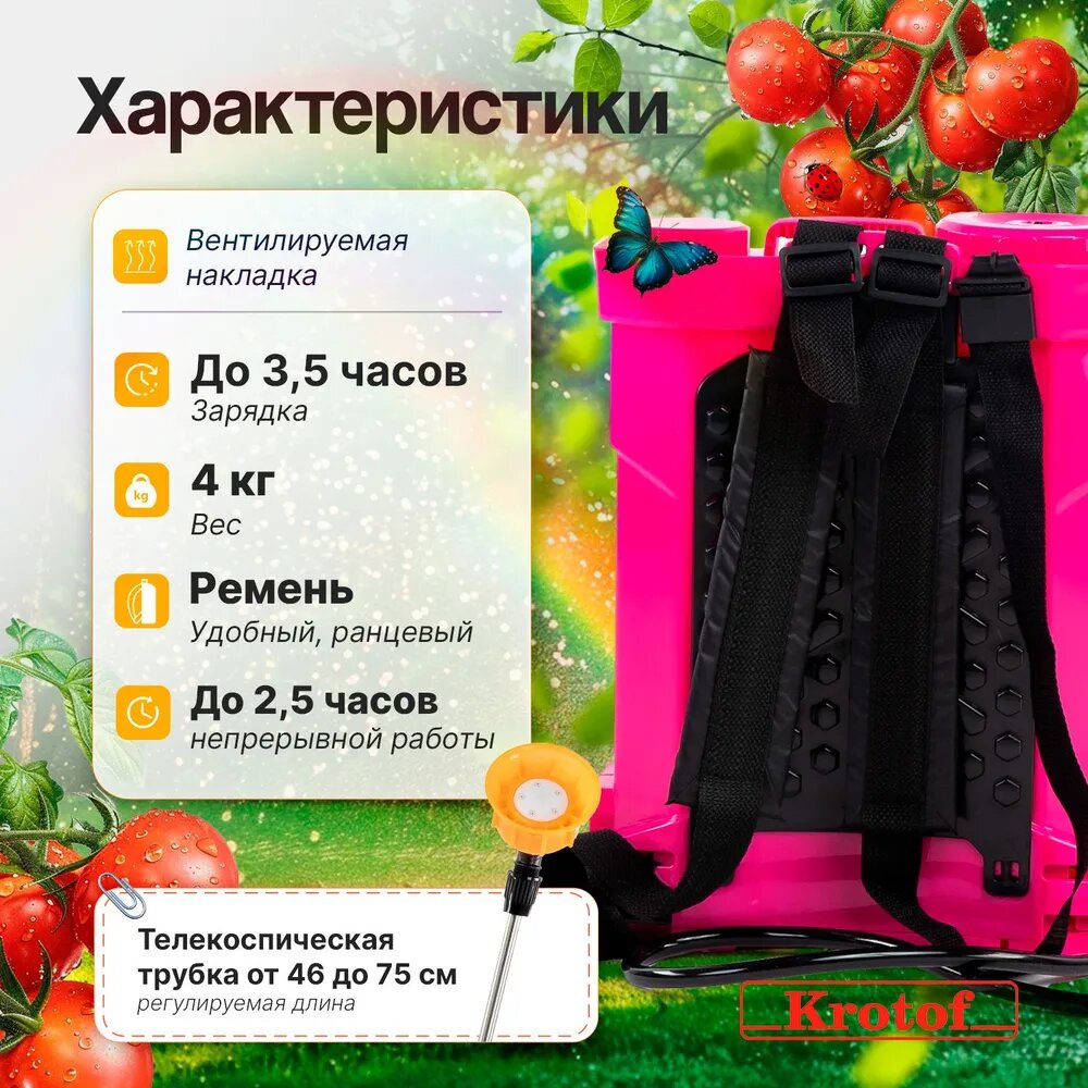 Отзывы на Опрыскиватель аккумуляторный KF-10C-3 Krotof на 10 литров, 4 форсунки, розовый / кротоф