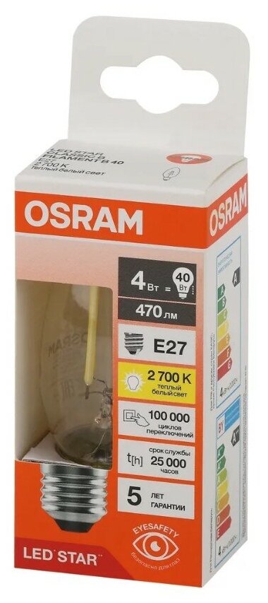 Отзывы на Лампа Светодиодная Свеча 4W 220-240V E27 470Лм 2700К Угол 300 град. D-35mm L-100mm Филаментная Стекло Свет Теплый белый OSRAM, уп. 10шт