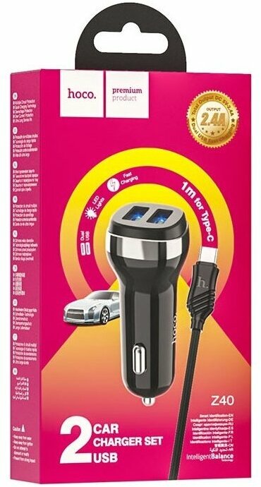 Автомобильное зарядное устройство (АЗУ) Hoco Z40 (2 USB) + кабель Type-C, 2.4 А, черный