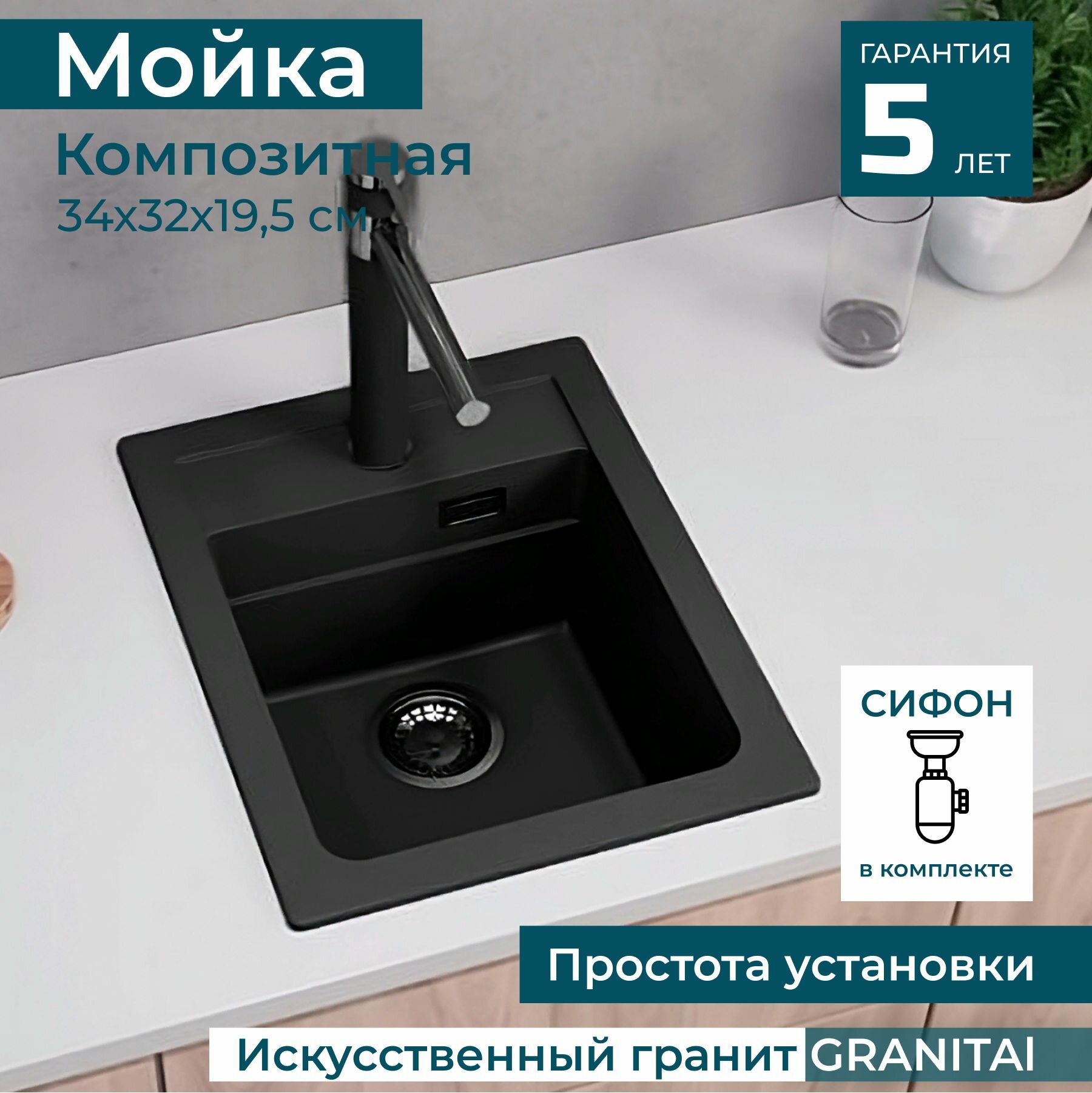 Каменная мойка для кухни врезная под / на столешницу ALVEUS GRANITAL ATROX 10 400 X 500 искусственный камень гранит с сифоном. Цвет черный