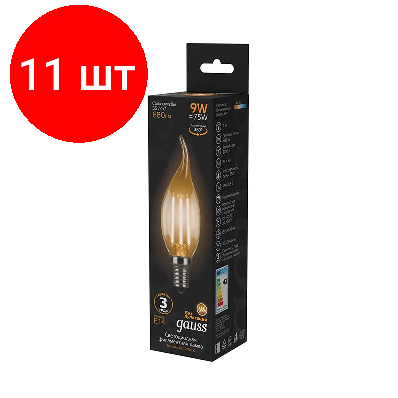 Комплект 11 штук, Лампа светодиодная Gauss LED Filament Свеча на ветру E14 9Вт 680Лм 2700K информация: