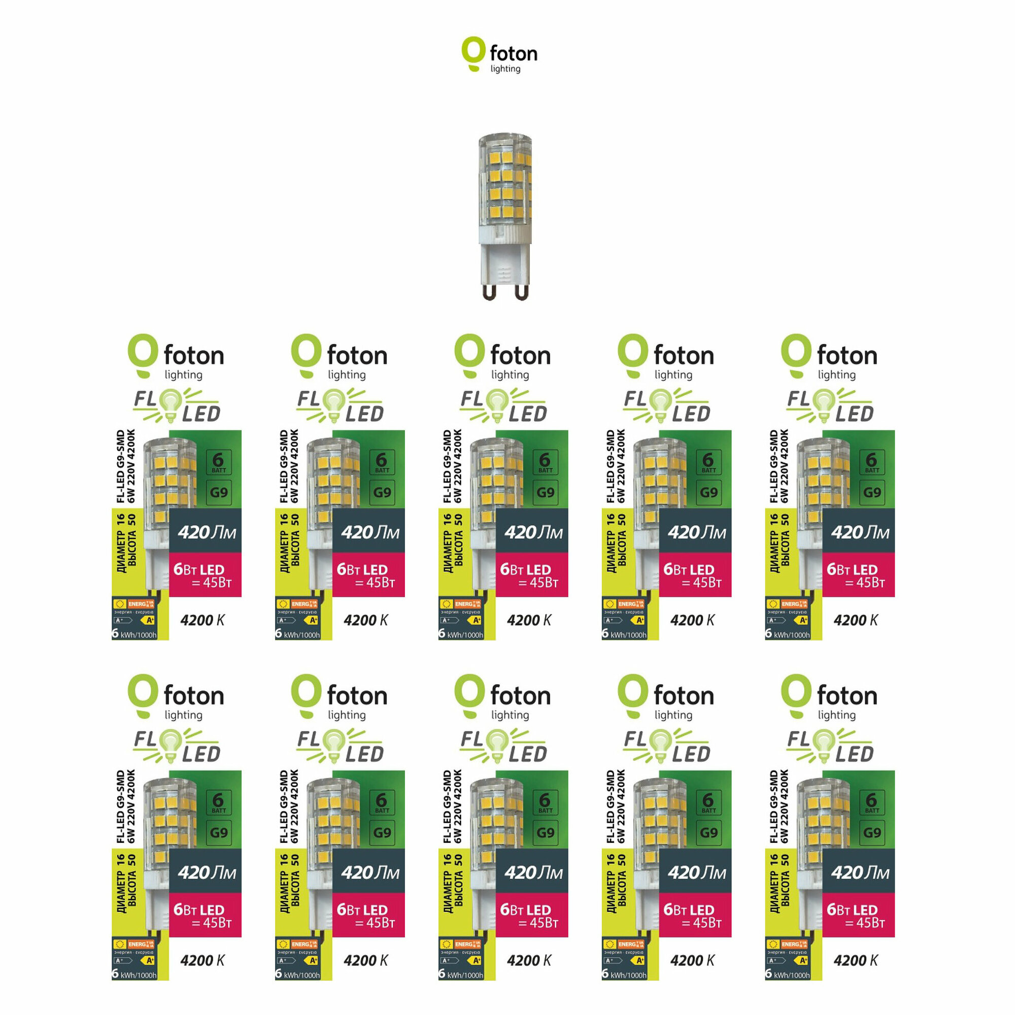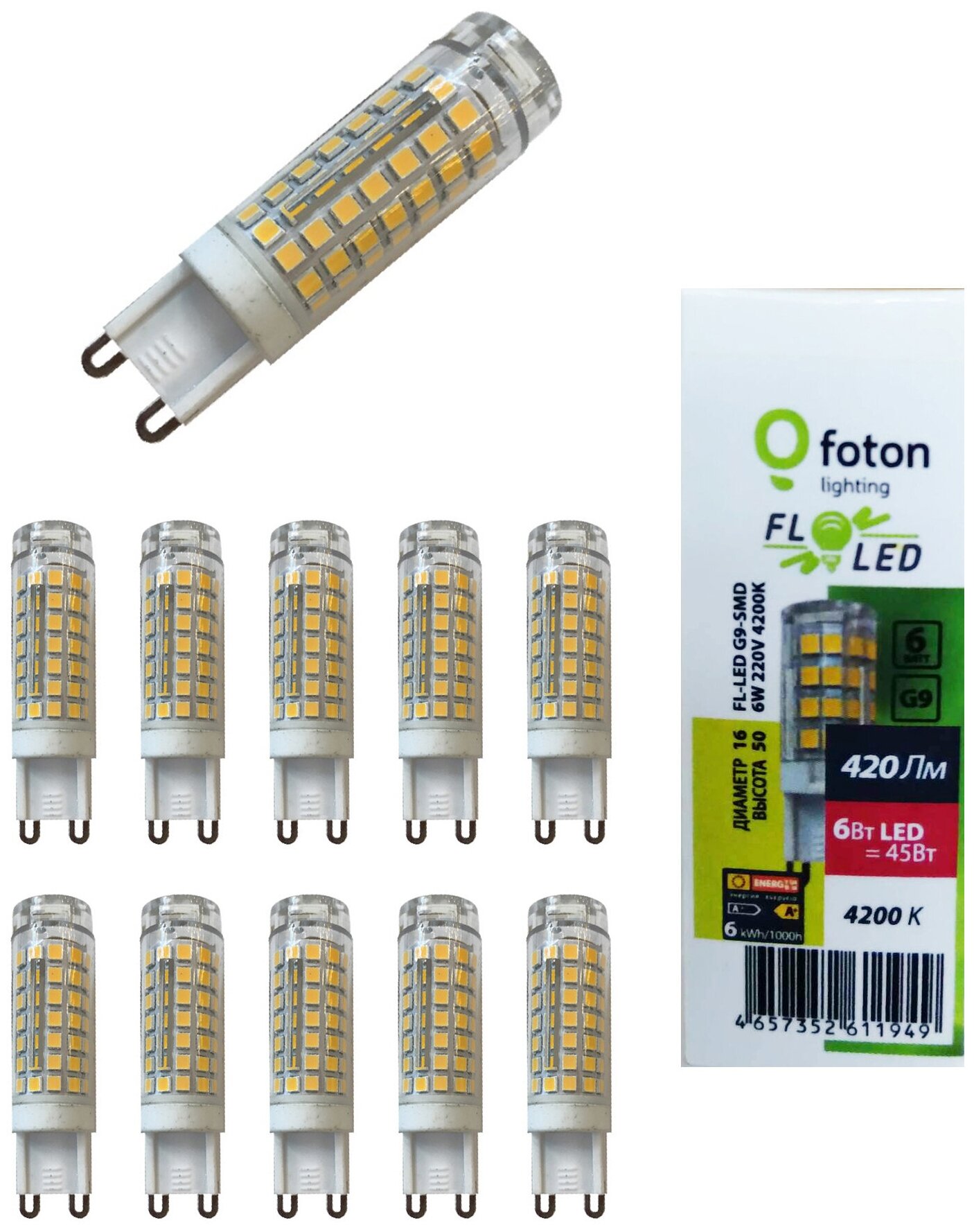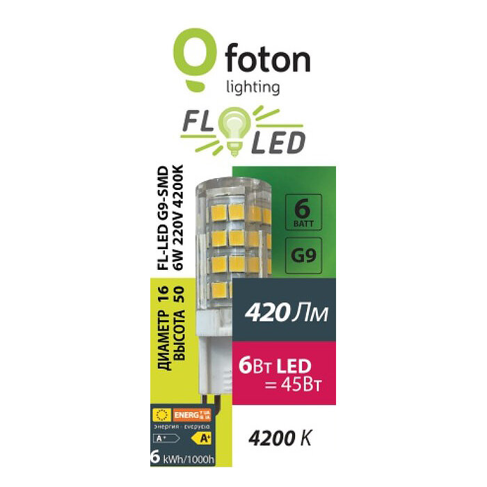 10 шт/уп. Лампа LED Капсула 6W 220-240V G9 PIN 420Лм 4200К Угол 360 град. D-16mm L-50mm Свет Нейтральный белый Foton Lighting, уп. 10шт 1 441 ₽
