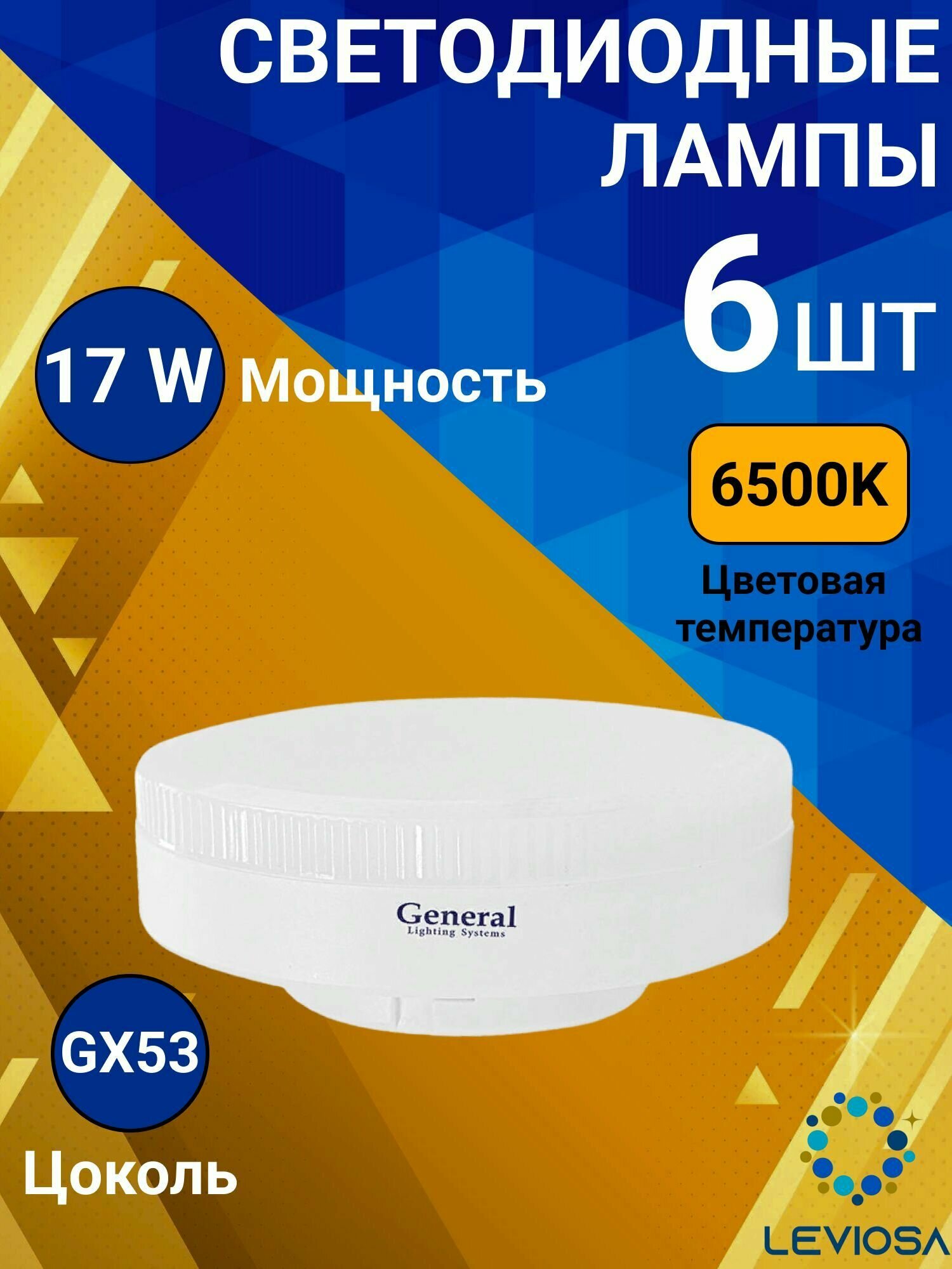 Лампочка светодиодная, General, Комплект из 6 шт., 17 Вт, Цоколь GX53, 6500К, Форма лампы Шайба, GX53 информация: