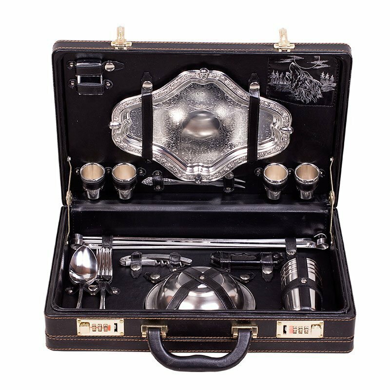 | Комплектация | 1. Кейс из искусственной кожи - 1шт. 2. Вилки из нержавеющей стали - 4шт. 3. Ложки из нержавеющей стали - 4шт. 4. Стопки из стали с никель-серебряным покрытием - 4шт. 5. Блюда для закусок из стали с никель-серебряным покрытием - 2шт. 6. Шампура из нержавеющей стали - 4шт. 7. Нож складной из нержавеющей стали - 1шт. 8. Тарелки из нержавеющей стали - 4шт. 9. Стаканы из нержавеющей стали - 4шт. 10. Зажигалка - 1шт. 11. Штопор-сомелье - 1шт. 12. Вилка для холодных закусок - 1шт. 13. Чехол для кейса из высокопрочного прозрачного пластика предназначенный для защиты от влаги и сохранения товарного вида - 1шт. |