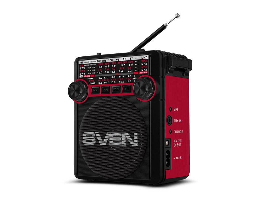 SVEN SRP-355 чёрно-красный Радиоприёмник (3 Вт, FM/AM/SW, USB, SD/microSD, AUX, фонарь, 900 мАч, 2 х D/UM)