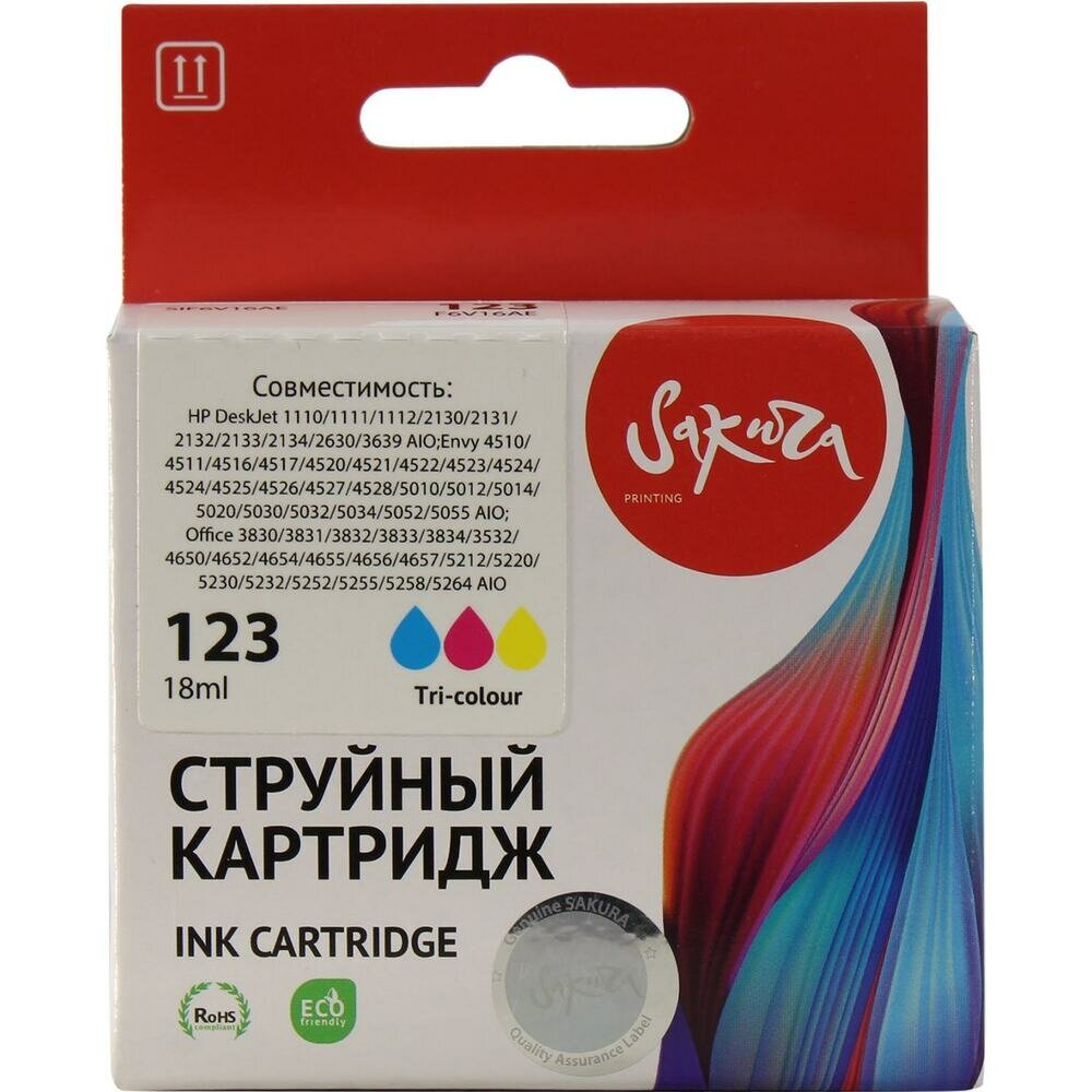 SAKURA PRINTING Струйный картридж Sakura F6V16AE (№123 Tri-colour) для HP, триколор, 18 мл., 330 к.