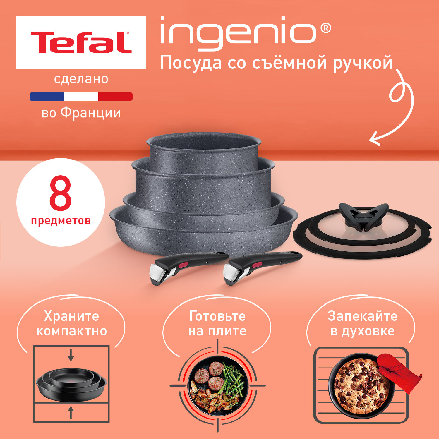 10 цен на Набор посуды со съемной ручкой Tefal Ingenio Natural Force L3969153, 8 предметов, с антипригарным покрытием, подходит для индукции