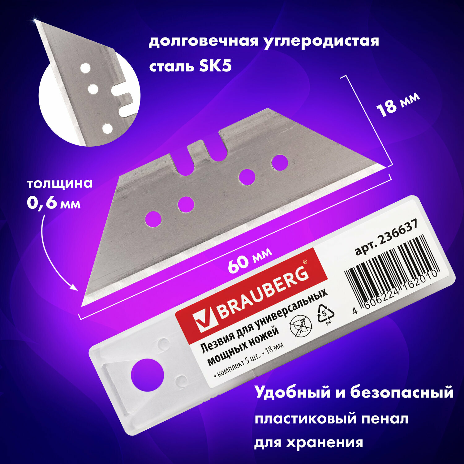 Лезвия для универсальных мощных ножей, 18 мм, BRAUBERG, комплект 5 ШТ., форма-трапеция, в пластиковом пенале, 236637 (цена за 1 ед.товара)