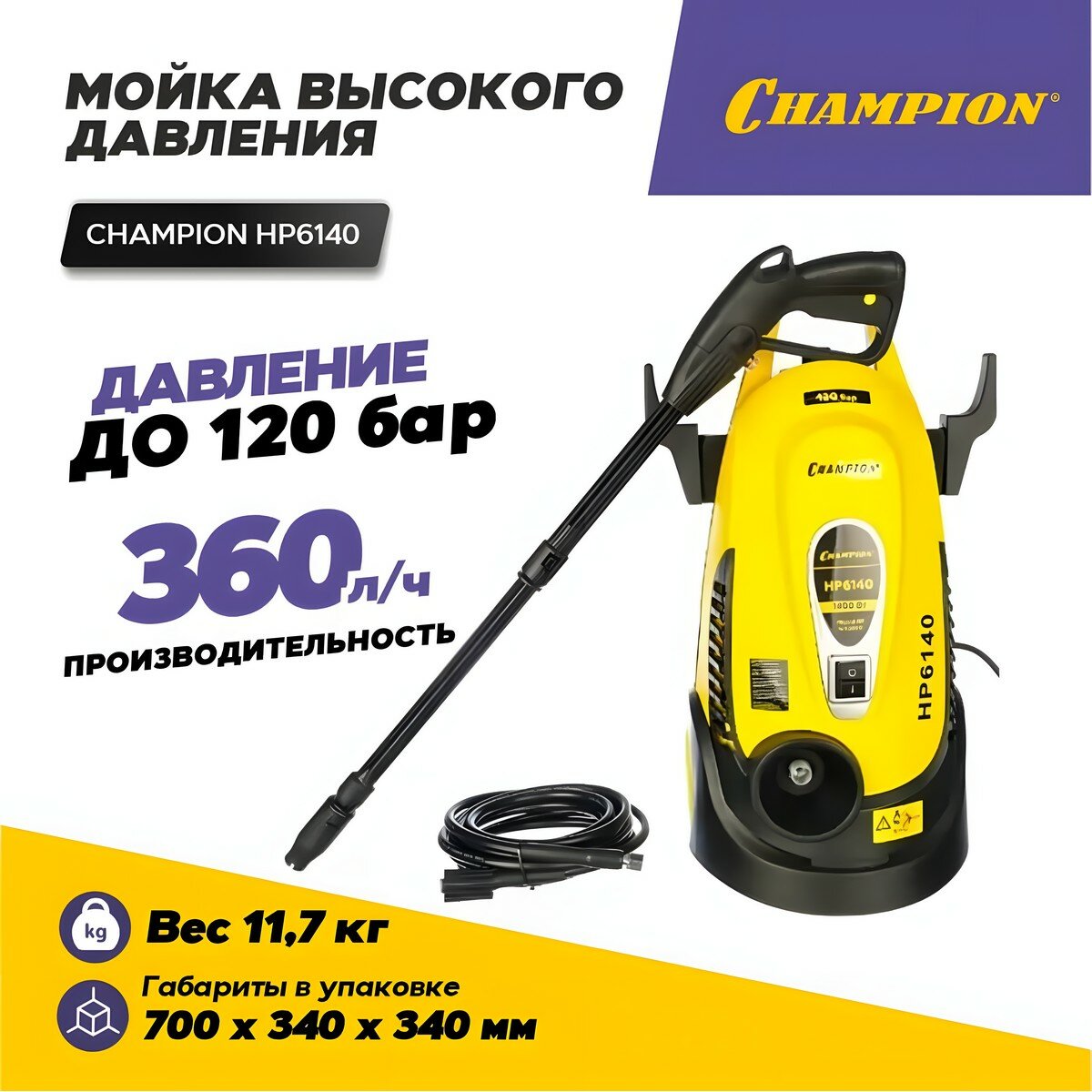 Мойка высокого давления, автомойка CHAMPION НР6140 с встроенной ёмкостью для моющего средства / минимойка для автомобиля, дачи и сада (1400 Вт, 360 л/ информация: