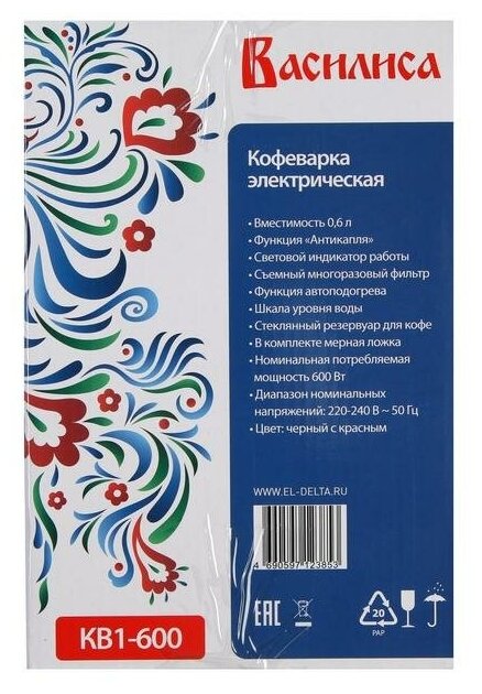 Кофеварка КВ1-600, капельная, 600 Вт, 0.6 л, чёрно-красная информация: