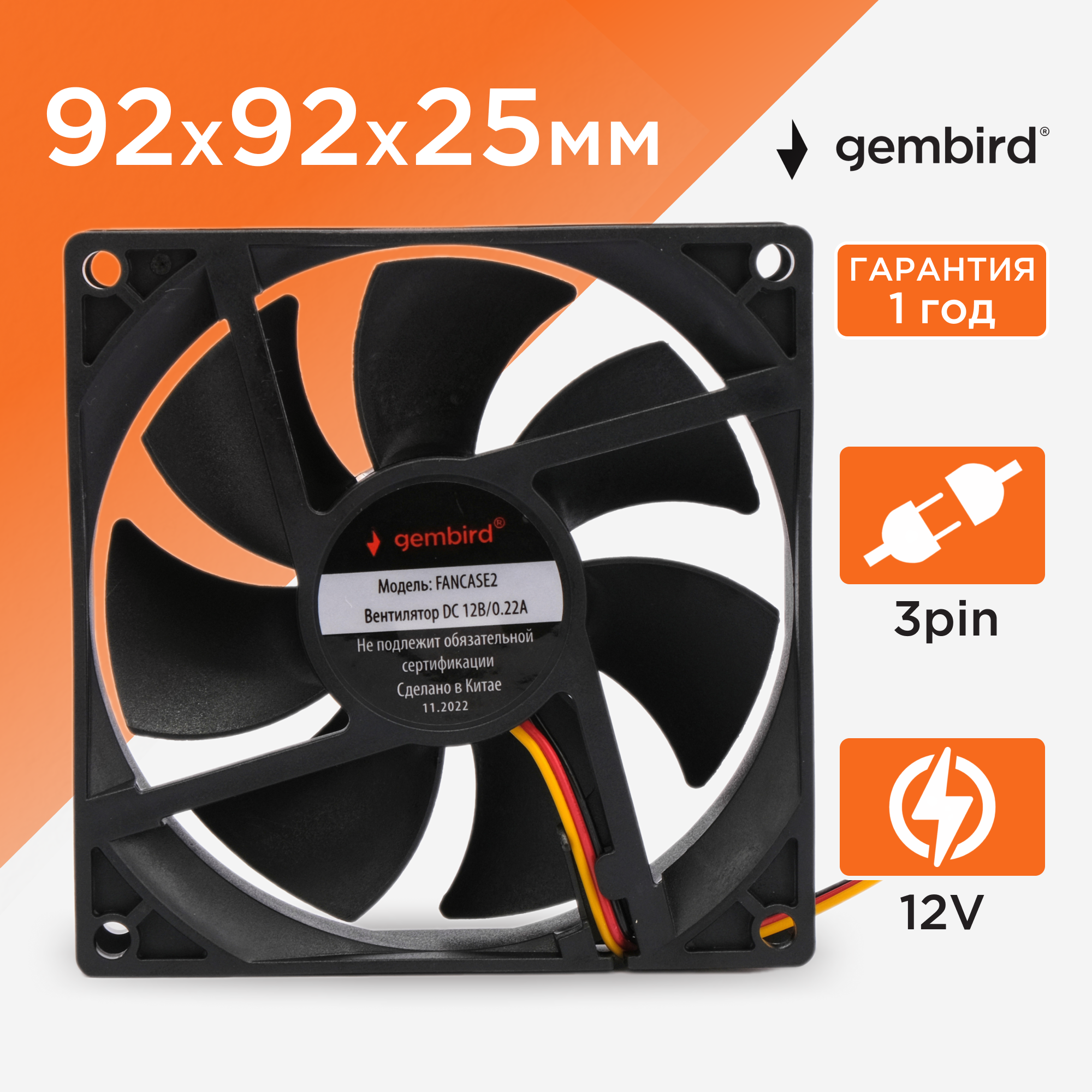 Вентилятор 12в 92 x 25мм Gembird FANCASE2 12V 0.22А втулка скольжения 3pin 30см 2500 об*мин 330 ₽