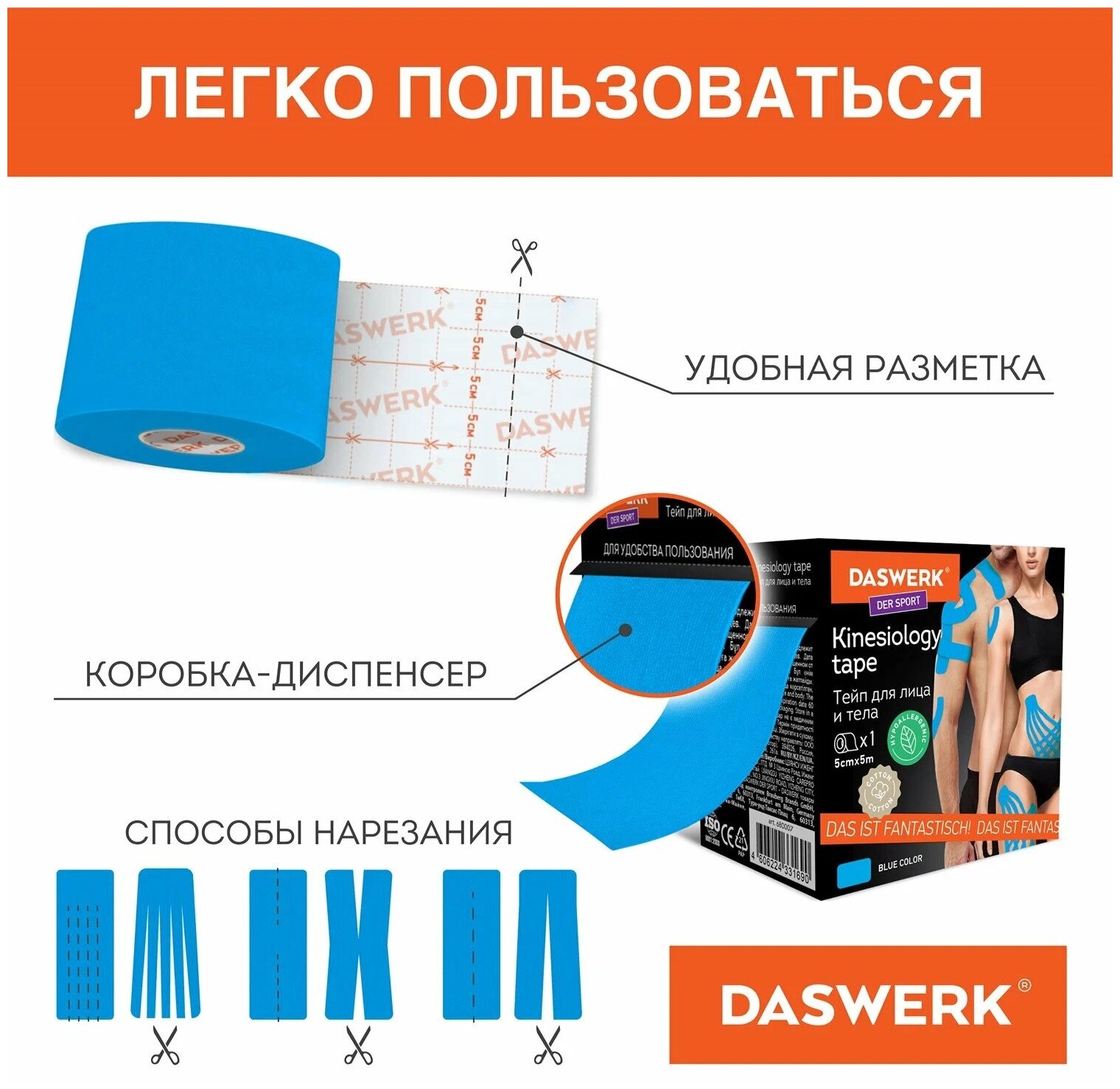 DASWERK Кинезио тейп/лента для лица и тела, омоложение и восстановление, 5 см х 5 м, синий, , 680007 информация: