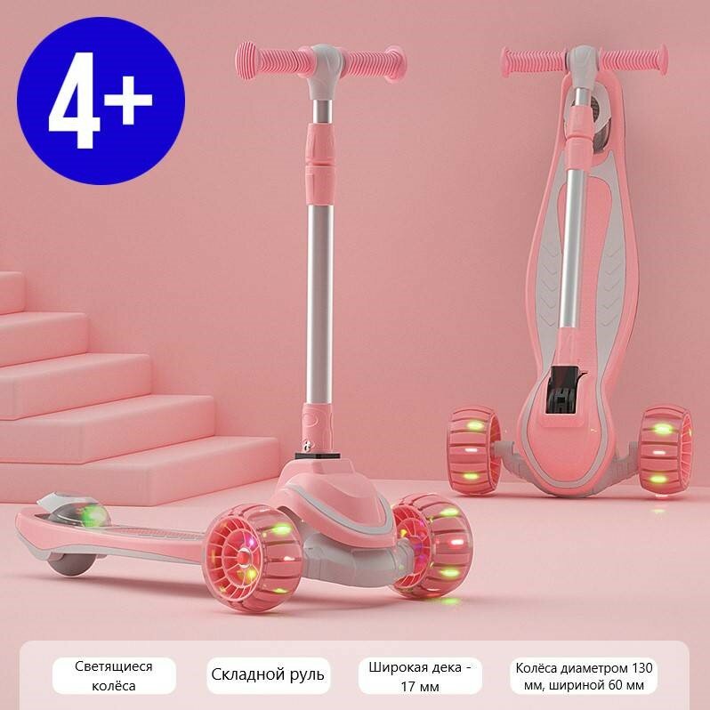10 цен на Большой трёхколёсный самокат со светящимися колёсами, складной, для детей от 4-х лет Scooter Maxi Lights 606 Розовый