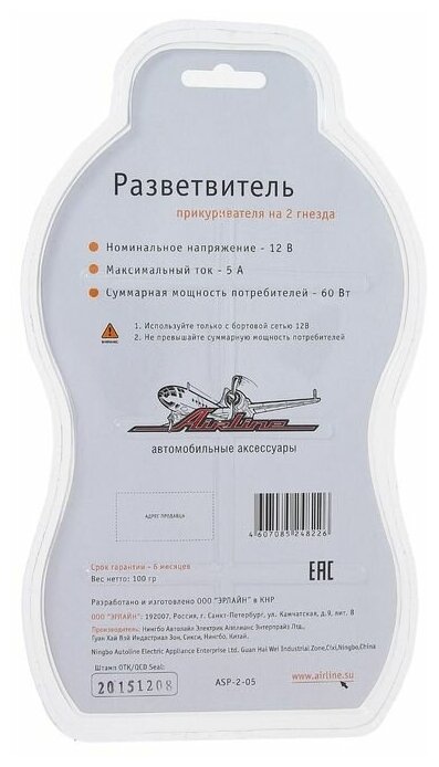 Разветвитель прикуривателя 2-х гнездовой 12V, ASP-2-05, AIRLINE информация: