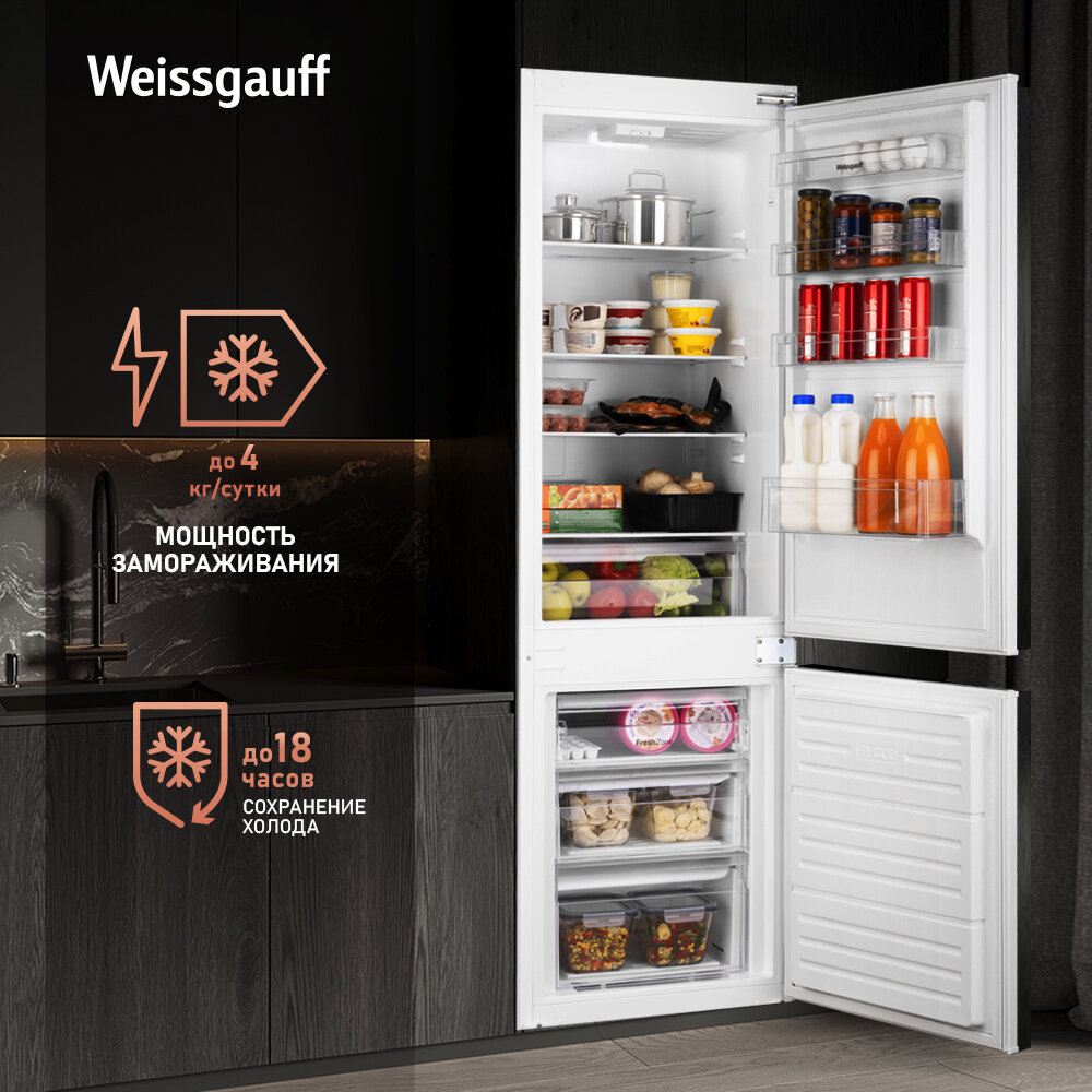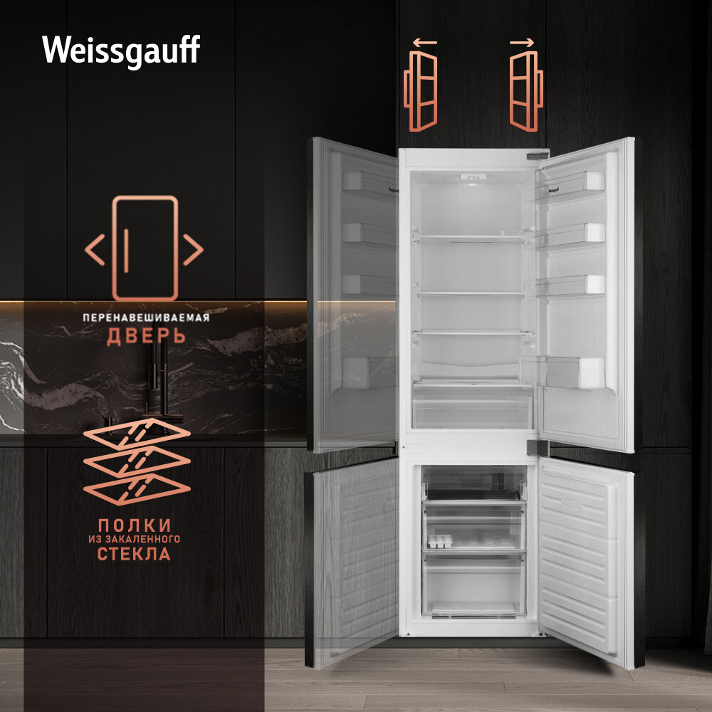 Встраиваемый холодильник Weissgauff Wrki 178 V двухкамерный, 3 года гарантии, Объём 256 л, Супер режим, Заморозка 4 кг сутки, Сохранение холода 18 часов, LED освещение камеры, Тихий режим работы, Перенавешиваемые двери, Полки закаленное стекло, А+ 51 490 ₽