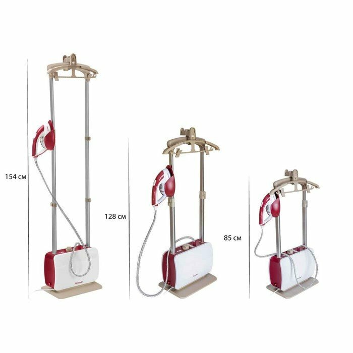 | Дополнительная информация | 2 положения гладильной доски (вертикальное и горизонтальное); 3 положения телескопической стойки; регулировка температуры; в комплекте: доска для глажения, плечики для одежды с прищепками для брюк и юбок, перчатка, воронка, мерный стакан |