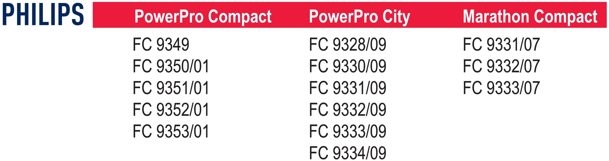 | Совместимые модели | PowerPro Compact FC 9349, FC 9350/01, FC 9351/01, FC 9352/01, FC 9353/01, PowerPro City FC 9328/09, FC 9330/09, FC 9331/09, FC 9332/09, FC 9333/09, FC 9334/09, Marathon Compact FC 9331/07, FC 9332/07, FC 9333/07 |